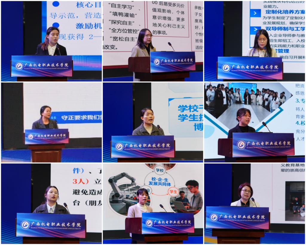 在典型案例分享环节,来自9个二级学院的辅导员代表紧扣辅导员九大核心职责,依次登台分享学生工作典型案例和实践育人成果。