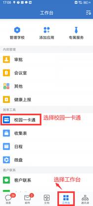 4.点击工作台,选择校园一卡通。