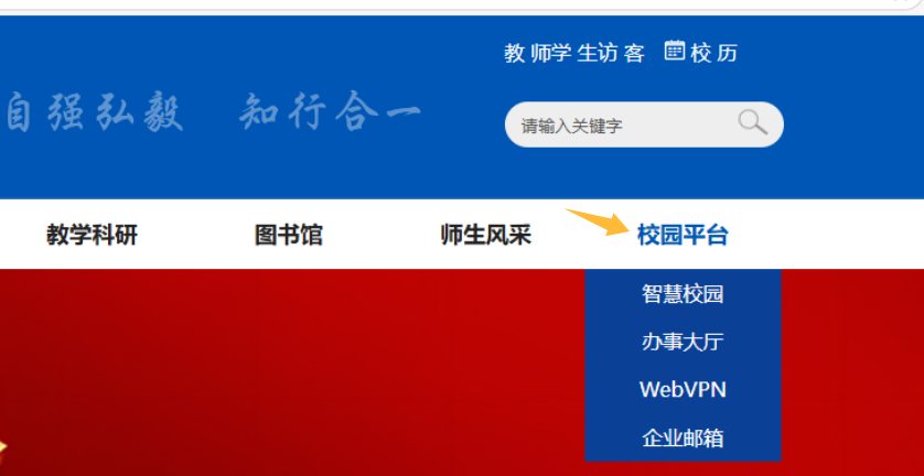 1.打开官网首页,点击“校园平台”,通过统一认证进入“智慧校园”或“办事大厅”。