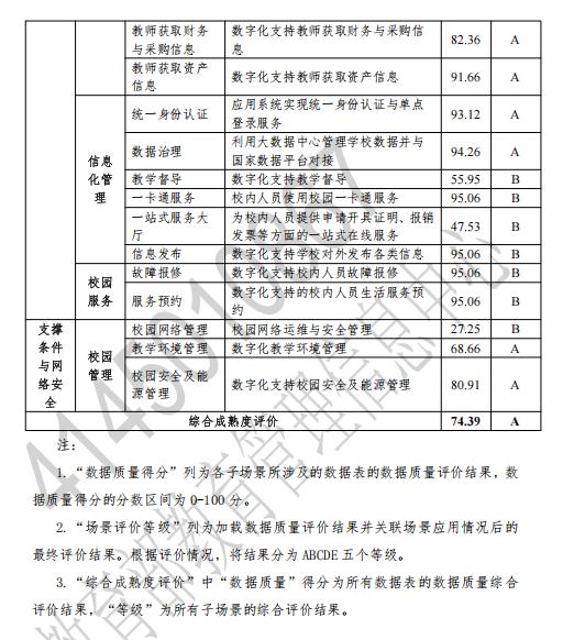 自2023年万象城官网入选教育部职业院校数字校园建设试点以来,根据教育部数字基座(职教大脑)对接要求,学校信息管理中心在各职能部门和二级学院的配合支持下,深入开展数据治理,强化数据标准,提升数据质量、推广场景应用,特别对教学管理、师生发展、学生工作、党建思政、校企合作、科研管理、资产图书、国际交流、管理服务等办学维度、32个数字化应用场景的数据进行了清洗整理。此次评估覆盖32个子场景,其中22个子场景被评为A级。