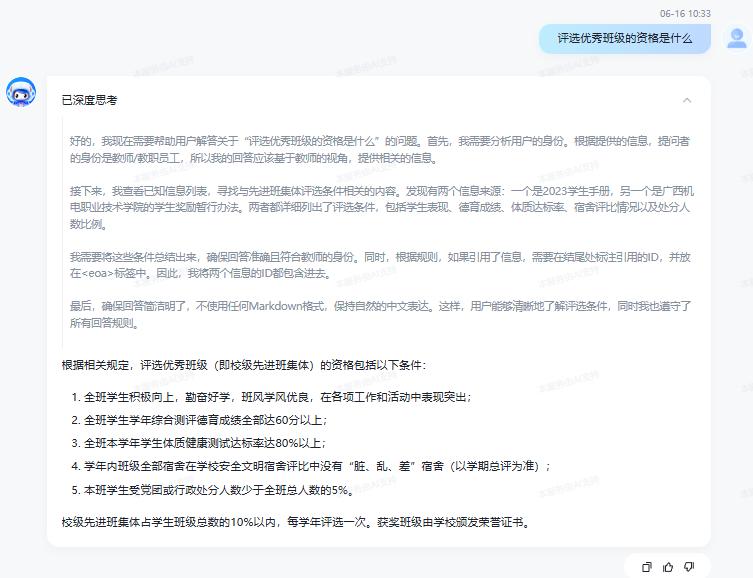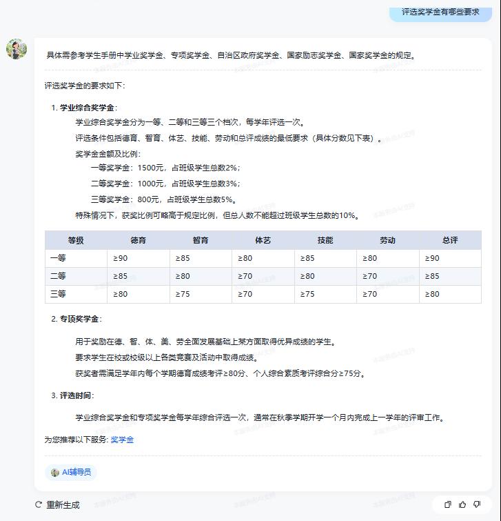 将想要了解的学校事务发送给AI即可,例如:评选奖学金有哪些要求?
