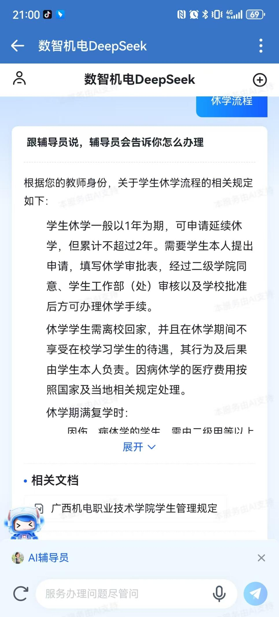 和电脑端一样,直接提问自己想要了解的学校事务即可,例如:休学流程。