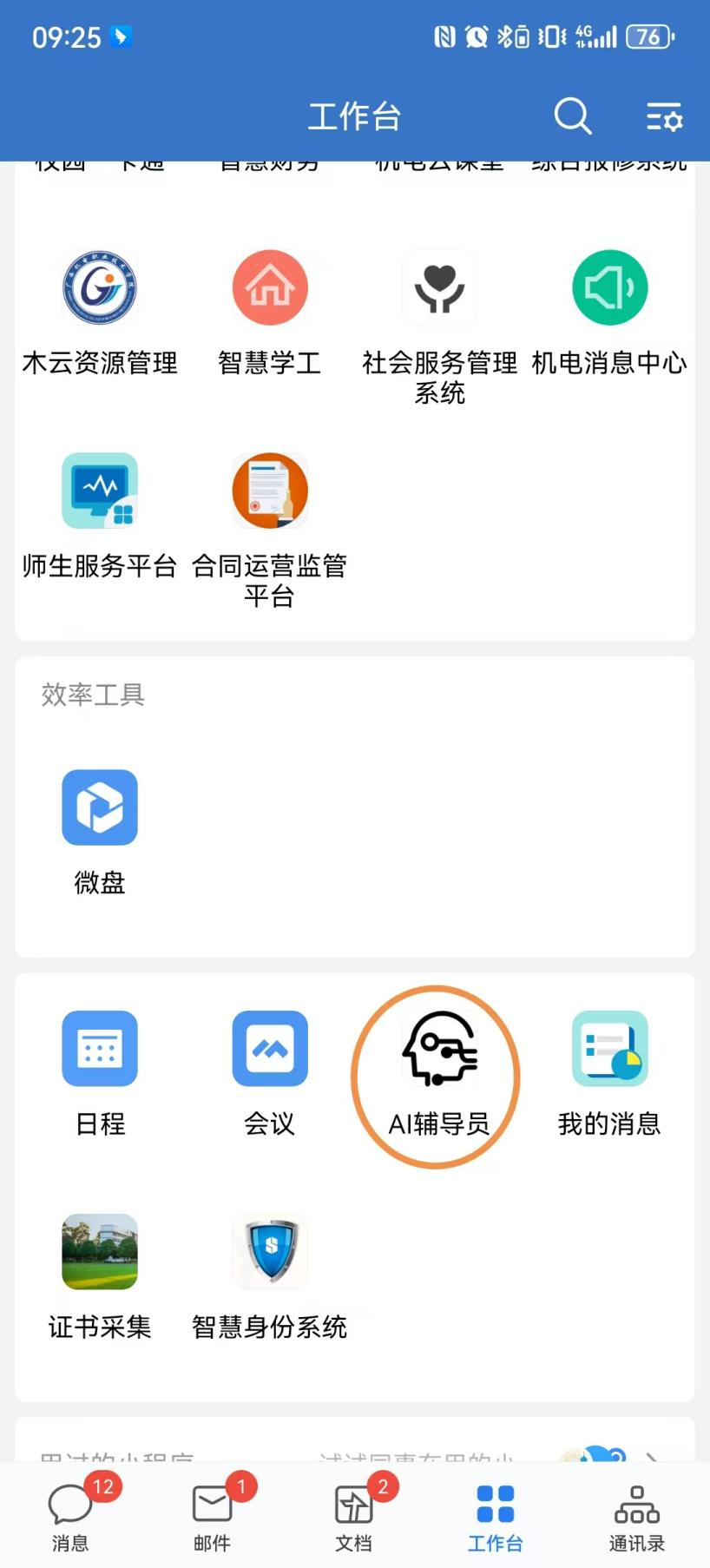 登录企业微信,并在企业微信中的工作台里找到AI辅导员点击进入。