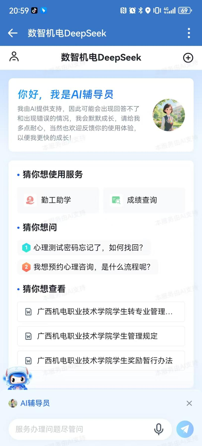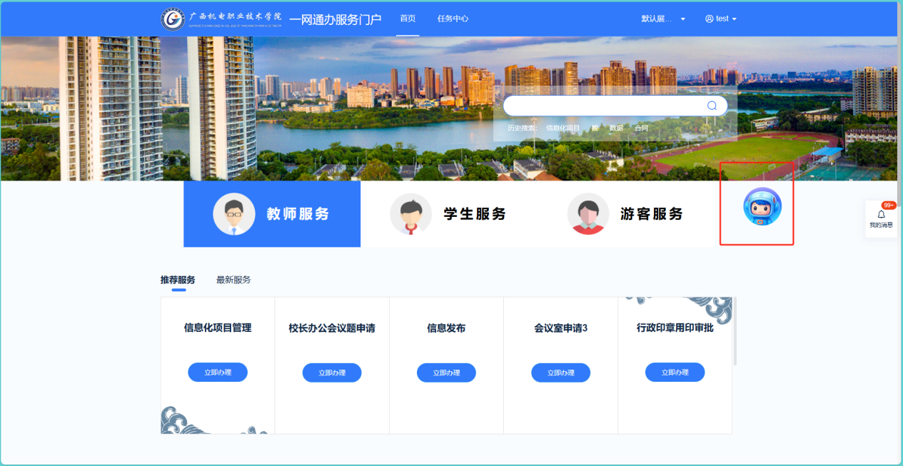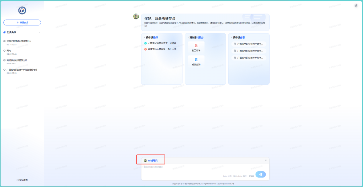 在浏览器中打开学校一网通办服务门户网址:https://nportal.gxcme.edu.cn/default/index.html#/点击桌面的AI小助手,进入AI问答界面,在输入框处找到AI辅导员并点击进入。