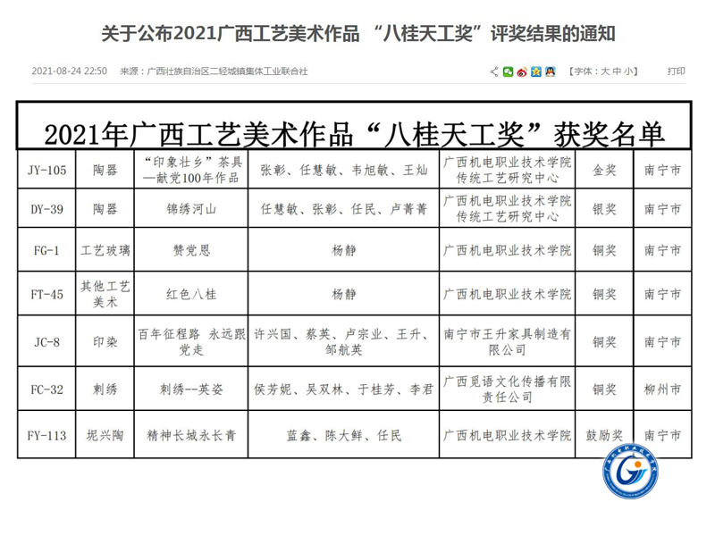 近日,由自治区工业和信息化厅、自治区二轻联社主办,广西工艺美术协会协办的“永远跟党走--2021广西艺术作品展览工艺美术作品暨广西工艺美术作品‘八桂天工奖’”评选活动在南宁举行。
