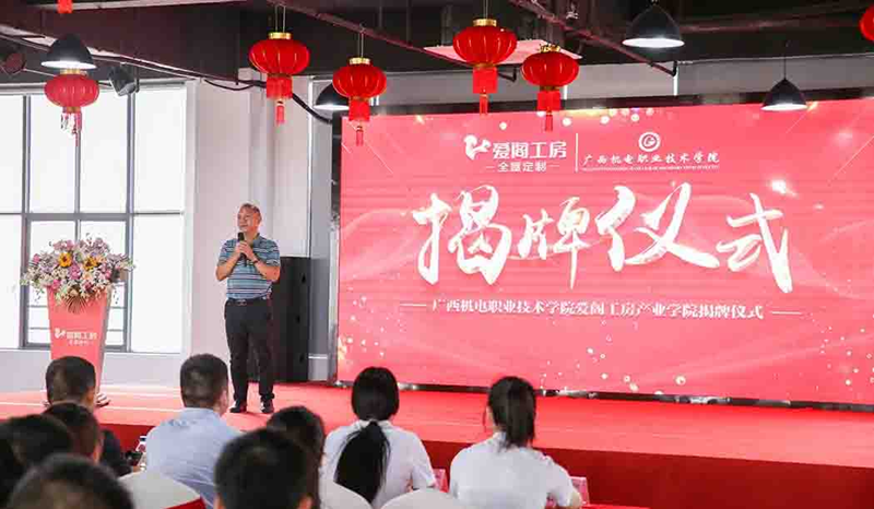 揭牌仪式上,刘永福院长代表艺术设计学院致辞,并在致辞中表示:此次揭牌是产业学院是深化落实校企合作的重要节点,是艺术设计学院深化产教融合具体实践,爱阁工房作为广西本土成长起来的全屋定制企业,投入大量人力物力为万象城官网产业学院建设创造了优越的学习条件。学校对产业学院的推进是落实和深化工学结合的重要举措,对同学们能更好的的学习专业知识、未来更好的走向工作岗位具有战略意义。希望同学们能做到刻苦学习,用积极向上的态度迎接一切挑战,并祝贺揭牌仪式圆满成功,祝愿学生学有所成,祝愿爱阁工房蒸蒸日上。