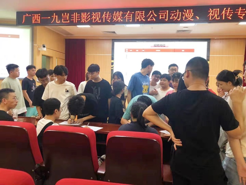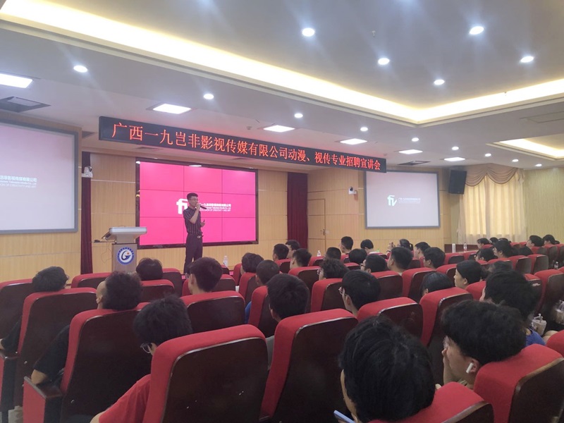 2021年7月7日,广西一九岂非影视传媒有限公司专场招聘宣讲会在博远楼5楼1号报告厅举行,来自动漫、视传专业的200多名学生参加了招聘宣讲会,马亚非总经理进行了校园招聘宣讲。