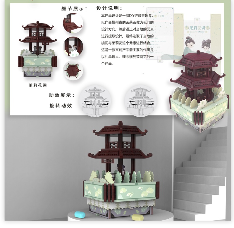 相对于传统以机械结构件加工与编程为重点的课程设置,工业设计专业的《UG软件应用》从学情出发,体现了“艺工融合”的课程特色,注重学生三维结构分析、运动仿真与检验的能力培养。围绕“好一朵美丽茉莉花”八音盒设计出发,进行茉莉文化历史故事调查——元素提取——动态结构分析——UG建模——运动仿真——激光雕刻——平面设计——产品渲染——包装成型——线上展示流程操作,通过项目“真实真做”,让学生涉及文创设计、结构设计、包装设计、数字媒体处理等环节的研究和实践,培养学生的精益求精的“工匠精神”,更好地与社会接轨。