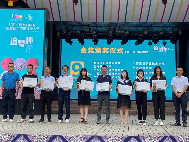 会议当天,还举行了广西职业院校2021年“追梦杯”艺术设计大赛展览开幕式与获奖作品颁奖仪式。本届“追梦杯”艺术设计大赛共征集到来自32所院校的2790余件作品,内容涵盖建筑室内设计、环境空间设计、乡村建设、民族建筑设计、工业设计、工艺美术设计、视觉传达设计、服饰设计以及配饰设计等艺术设计类别,经过专家评审,我院一共荣获金奖2项、银奖2项、铜奖13项、优秀奖17项。