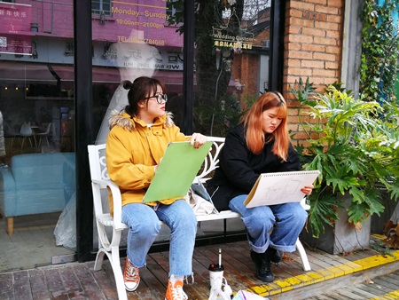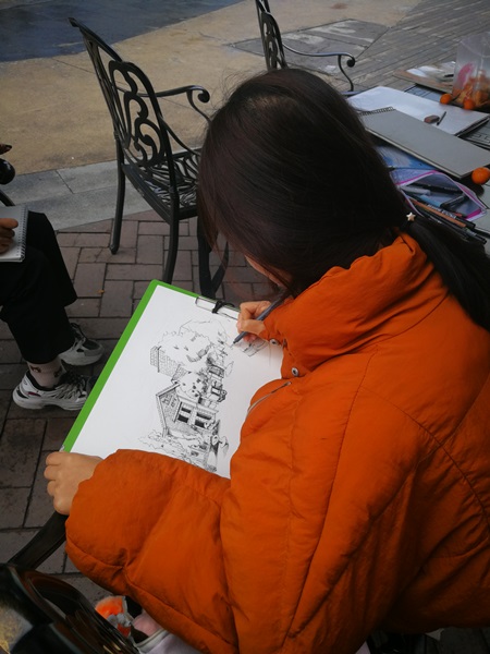 本次写生在我院和百益上河城展开,虽然天气很冷,但是抵挡不住同学们的绘画热情。同学们神情专注,在老师的指导下,用笔认真的勾勒出他们眼中美丽的景色。把校园里绿意盎然的优美环境、苏式风格的建筑和百益上河城富有创意的情景式街区跃然纸上。