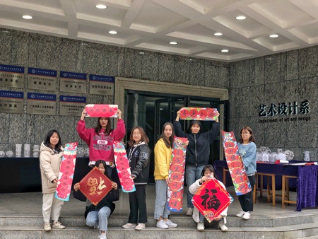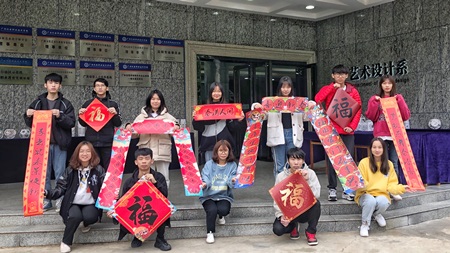 喜庆热烈的气氛立即吸引了不少社区居民驻足观赏,大家纷纷对设计作品表示了赞美之词,也提出了不少宝贵意见,为艺术系迎接一个喜气安详的新春佳节增色不少。此时此刻同学们也已经整理好行囊准备回家,计划用亲手设计的春联给父母送上在外求学的满意答卷。