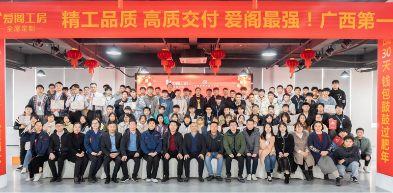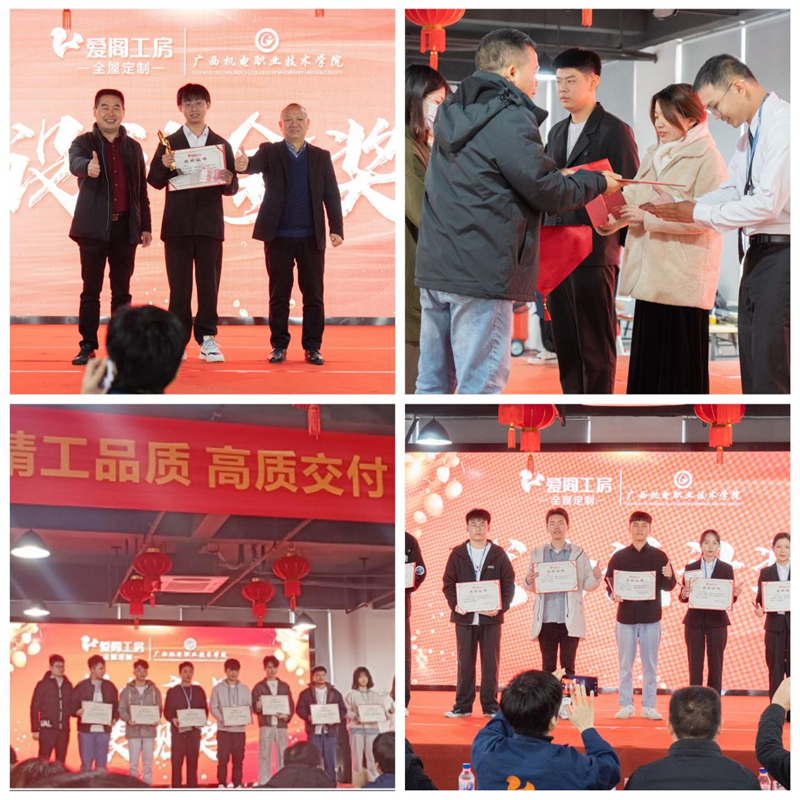 产业学院办学模式是学校突破传统育人模式又一创举,是提升人才培养质量的重要举措之一。在学校领导的关心和支持下,艺术设计学院与广西福之凯家居有限责任公司合作成立爱阁工房产业学院,在教学过程中,企业举公司之力,由企业高水平设计人员组建教学团队,经对学生职业倾向和心理素养测试后,以强化“听、说、想、算、做”的能力和素养的训练为重点,以企业真实项目为载体,实行“项目+平台轮训+岗位实战”培养模式,让学生在企业的“研发-设计-生产-销售-服务”的生产闭环中不断强化专业技能和职业素养学习,达到全屋定制行业用人标准,满足爱阁工房用人需求。