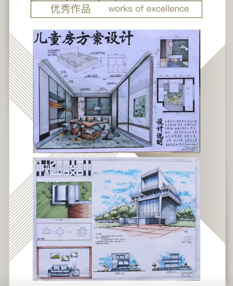 一幅幅栩栩如生,色彩鲜明的作品展现了出来,从平面、立面、剖面、效果图进行训练。作品内容广泛,表现技法多样,彩铅、马克笔均有涉及。让学生早早具有空间表达思维,为下一阶段学习打下扎实的基础。