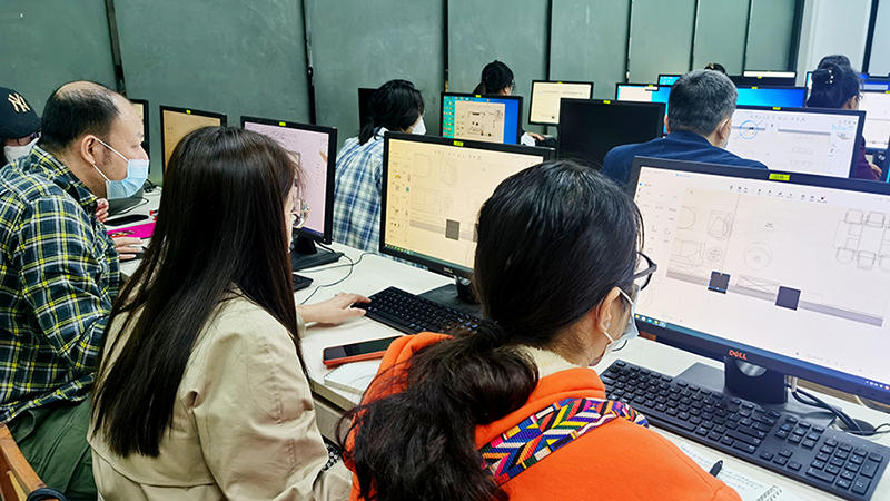 此次培训,兰育平老师先分享了学生及其的设计作品,并谈谈个人课堂教学的体会,认为酷家乐彻底改变了让学生望而生畏的3dsmax、SketchUp等软件复杂的三维制图模式,其易学易用,实现智能设计,让教师更好地集中精力强化训练学生的制图规范、空间思维、设计美学、工程材料、施工管理的关键能力与素养。接着,兰老师结合自身设计项目实践经验,采用项目教学法,详细地讲解了酷家乐云设计软件的室内户型生成,空间界面设计、软装搭配、灯光渲染、全屋定制等方面的内容。通过一天高强度的学习及实操训练,老师们基本掌握了软件操作方法,对当前行业数字化智能设计软件有新的认识,共同探讨专业课程教学的新思路,调整教学模式,切实增强学生专业核心竞争力。