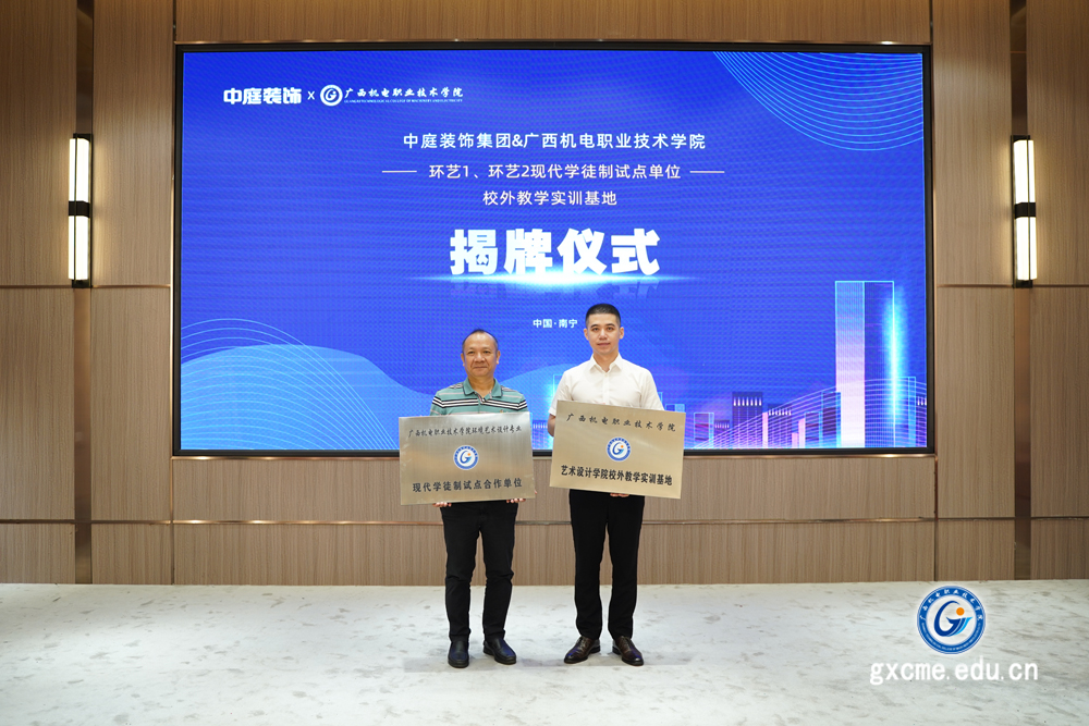 7月1日,万象城官网与广西中庭装饰集团在中庭装饰集团总部举办环境艺术设计专业现代学徒制校企合作签约仪式。万象城官网艺术设计学院院长刘永福、副院长任慧敏、副院长兰育平、副书记梧雨璇、中庭装饰集团副总裁张浩熙、副总裁吴文战出席签约暨授牌仪式。