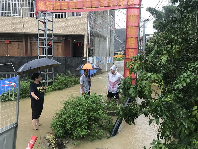 迎雨而上,争当防汛战斗员。近日,旧门村出现持续强降雨,岭头屯因公路扩建施工原因,导致排水不畅,村屯道路及少数民房已被积水淹没。为保证人民群众生命财产安全,我院派驻该村的第一书记李育好迅速行动,不怕困难,冒着大雨奔走在防汛第一线,在风雨中彰显责任担当,积极发挥党员先锋模范作用。在暴雨中查看水情,组织人员开展转移群众、水道垃圾清理,泄水口疏通等防汛排险工作,并与支书商议联系公路扩建单位,调用挖机扩大排水口,以快速解决积水问题,排除群众生命及财产的安全隐患。同时安排村“两委”干部劝阻群众照看好自家小孩,注意安全,不要围观。