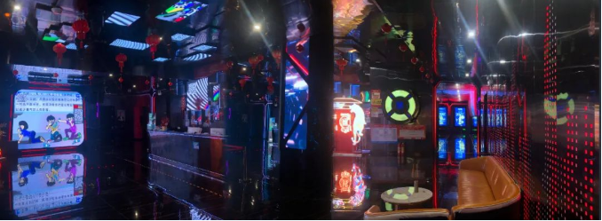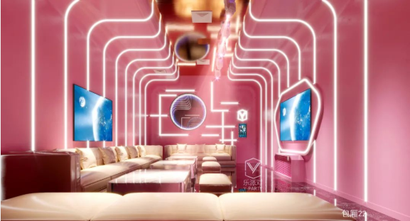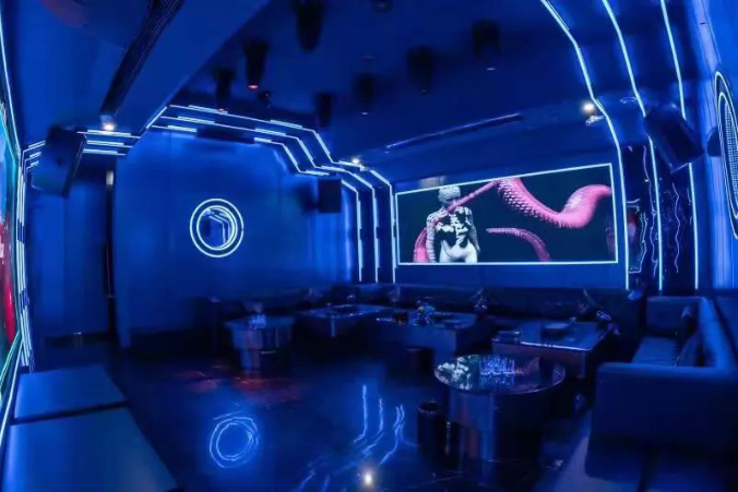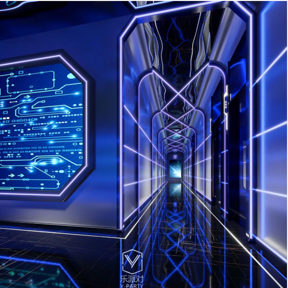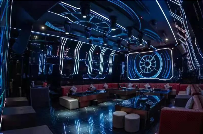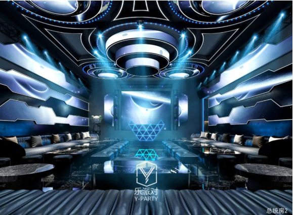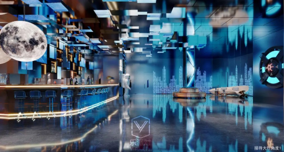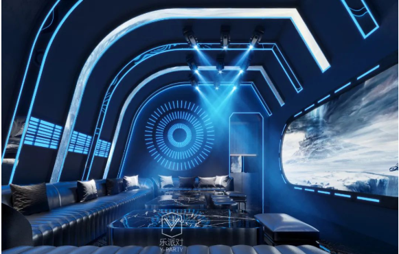 本案基于消费者沉浸式娱乐体验和安全保护的考虑,以太空科技为主题,以太空科技蓝为主调,采用回字形规划空间布局,规划了接待大厅、服务配房、厨房和包厢等空间。在各个空间以太空舱、飞船等为造型元素进行设计,在各空间立面、天面采用大量led灯光线、镜面不锈钢等材料,营造科技梦幻的空间效果,而地面则采用仿古砖,强化地面防滑耐腐,保护客户安全,让人在太空般的空间里彻底放飞自我,却安全着陆的完成一次非凡体验之旅。