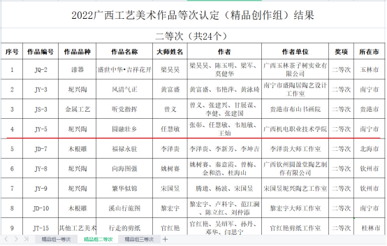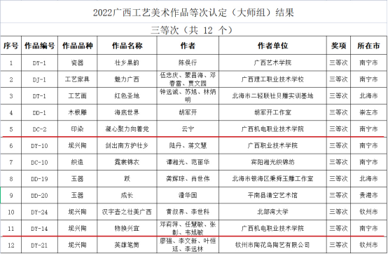 张彰、任慧敏老师创作的茶器作品《圆融壮乡》荣获广西工艺美术大师精品创作工程精品奖二等奖;云宁老师创作的作品《印染》荣获广西工艺美术“八桂天工奖”(大师组)三等奖;邓莉萍、任慧敏、张彰老师创作的茶具作品《物换兴宜》荣获广西工艺美术“八桂天工奖”(大师组)三等奖;以上作品同时入选“走好新征程 奋进新时代”2022广西艺术作品展。