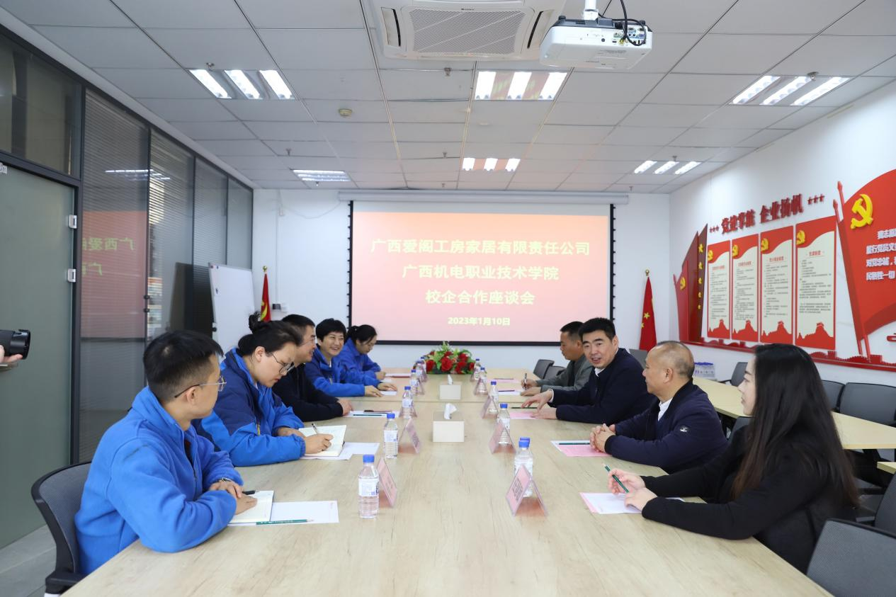 紧接着,双方进入会客室进行座谈交流,汤建国总经理对黄小敬书记一行人的到来表示热烈的欢迎,并对公司的校企合作发展目标和要求做了详细的阐述,汇报企业和万象城官网共建“爱阁工房全屋定制产业学院”建设情况,希望继续和万象城官网在人才培养、科研等方面开展更紧密、多层次的合作;随后,黄小敬书记对学校的专业设置、办学特色、招生就业、校企合作等方面做了重点介绍,感谢爱阁工房对万象城官网人才培养支持,希望双方进一步整合优势和资源,深化产教融合,创新艺术设计类人才培养模式,打造专业人才培养特色,助力校企协同发展,为广西绿色高端家具产业发展提供智力支持。