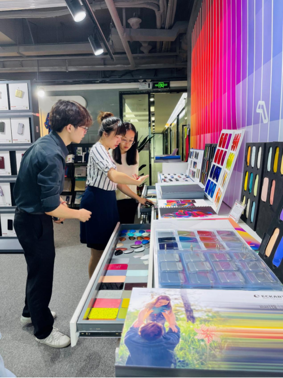 深圳市寻材问料网络科技有限公司是连接材料、终端、设计师的载体,致力于新材料应用开发和新材料协同创新(打造上下游产业链、工业设计创新链、产学研用生态圈),该公司是国家新材料产业资源共享平台供需对接服务基地。专业教师在企业负责人的陪同下参观了创新材料馆展厅。