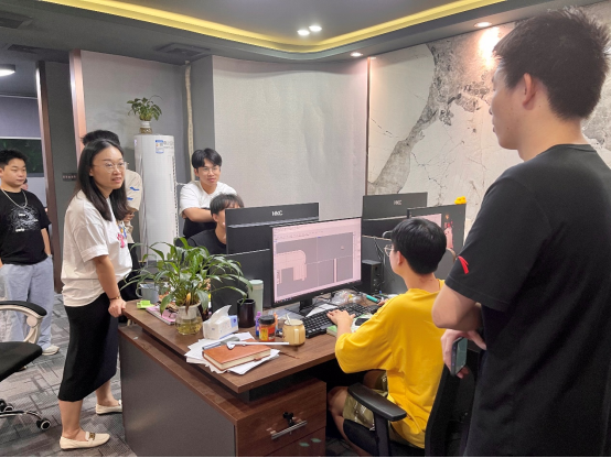图:专业教师与企业工业设计总监谭渊明(左二)交流