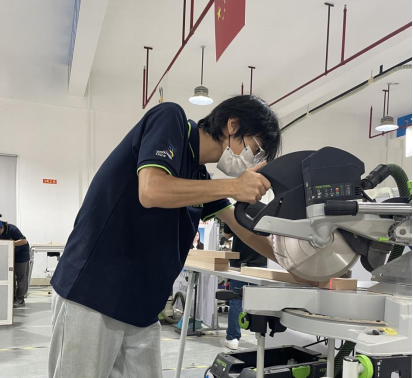 比赛现场,韦成浩在认真制作家具