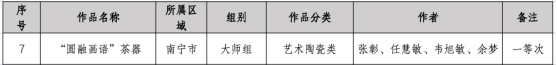 获等次认定作品均入选由自治区人民政府举办的2023广西艺术作品展览,其中张彰、任慧敏、韦旭敏、余梦作品《“圆融画语”茶器》被授予2023广西艺术作品展览优秀作品。