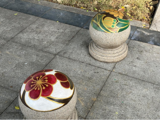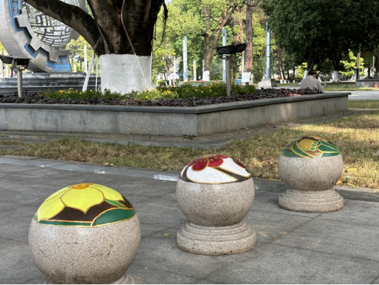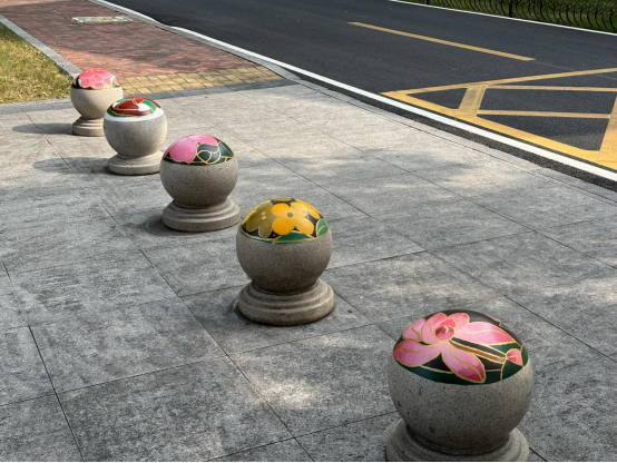 此次志愿服务活动,在潘奕杉、张彰两位老师的指导下,环境艺术设计专业的20名学生,对校园的石墩进行了整体考察与设计,以此为画板,精心创意和制作,将原本千篇一律的石墩变成了一道独特、靓丽的景观。从传统的中式纹样,到充满地域特色的植物、花卉,展现出了青年学子的蓬勃朝气,展现出了中华优秀传统文化的博大精深。