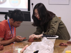 下午,代表团走进坭兴陶技艺课堂,学院黄莉翔教师以“千年窑火中的非遗密码”为题,系统梳理了“中国四大名陶”之一的坭兴陶从唐代至今的发展脉络,详解其“窑变无双、陶刻成韵”的艺术特征,并介绍了烧制制作全流程工艺。通过实物展示,使成员能够身心触及物品更直观体验非遗文化。在陶胚上色制作以及动手直塑陶艺的环节,泰国成员以刀为笔,涂上颜料后在陶坯上刻出莲花、大象等象征中泰友谊的纹样,部分学员还融入了泰国传统图腾元素,赋予作品跨文化意蕴,从泥土到艺术品的每一步都充满智慧。