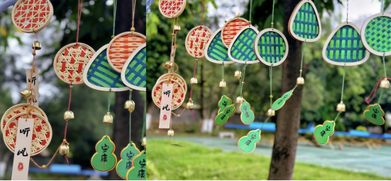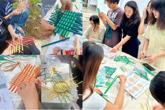 活动现场,环境艺术设计专业团队以竹编技艺为载体,系统展示了传统手工艺与环境设计领域的深度联结。专业教师与学生进行竹编风铃等编织演示,将非遗作品作为空间景观的载体,生动呈现了“非遗技艺走进现代生活” 的设计理念,既保留了竹编工艺的质朴质感,又赋予其符合现代生活需求的功能性与艺术性;部分竹编构件设计则融入了现代极简风格,通过结构创新让传统竹材在空间设计中焕发新生。