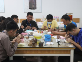 学院通过非遗文化搭建“技艺共研、情感交融”的立体化交流平台。在冯甜、黄莉翔两位老师指导下,泰国学员通过扎染的"几何解构"感知东方审美哲学,借助坭兴陶技艺的"型色嬗变"体悟工匠精神。特别设计的"中泰友谊纹样创作"环节,使传统技艺焕发现代生命力,学员创作的《澜湄织韵》、《象屿陶语》等作品成为跨文化对话的生动载体。泰国罗勇技术学院领队表示:“这些承载两国友谊的艺术品,是职教合作促进民心相通的最佳见证。”