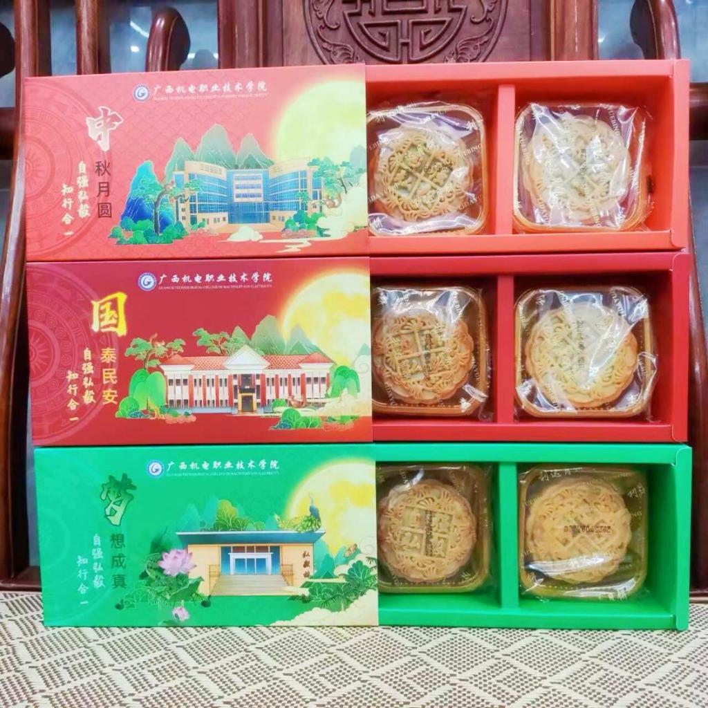 月饼的盒面印着机电标志性建筑——弘毅楼的沉稳、图书馆的静谧、行政楼的亲切,于方寸之间,定格朝夕相伴的校园记忆。饼身刻着 “自强弘毅,知行合一” 的校训,一口香甜里,藏着学校对大家的期许与鼓励。