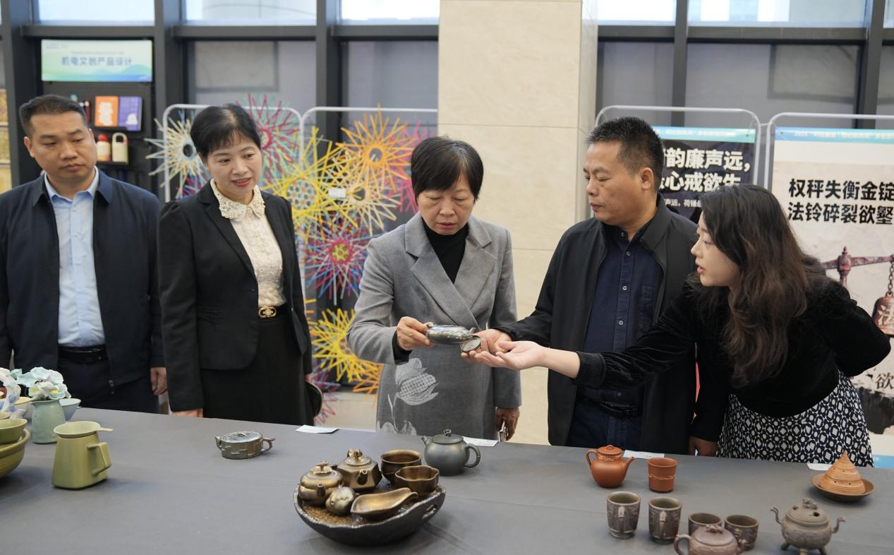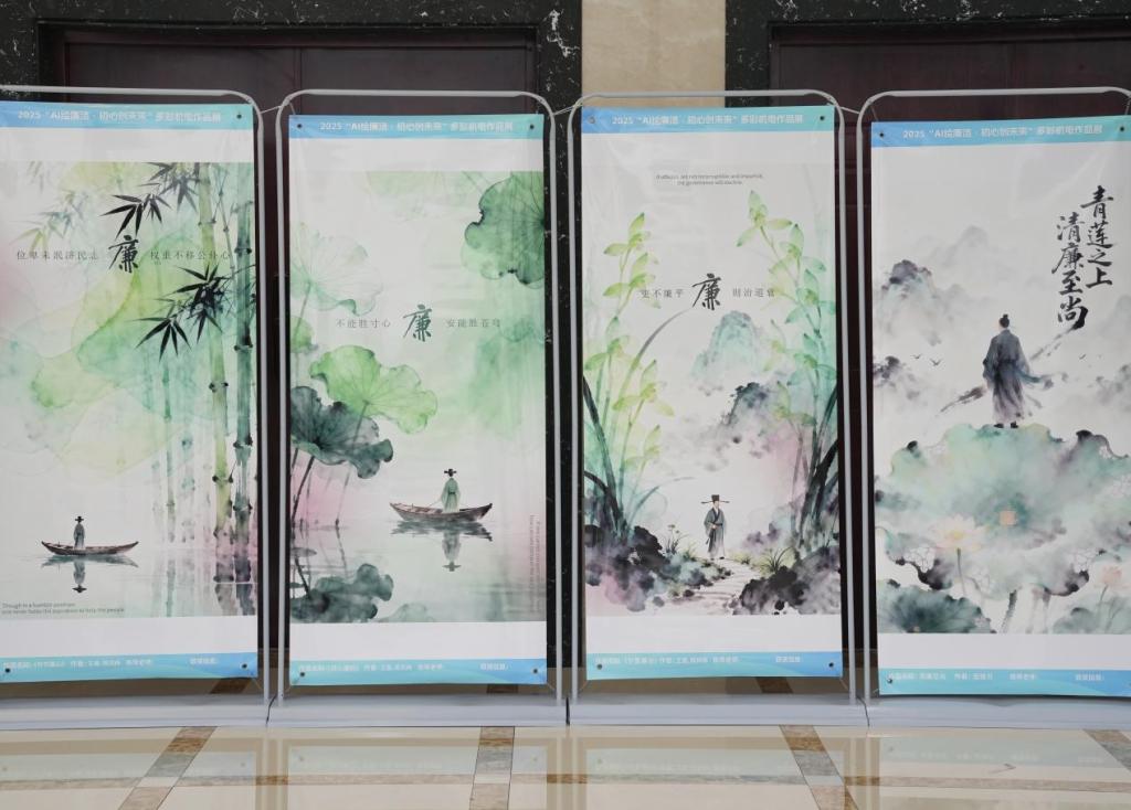 其中,“传统工艺廉洁呈现展区”以坭兴陶、木雕等传统工艺为载体,通过器物造型、纹样象征与工艺美学,生动刻画廉洁精神,彰显了廉洁文化深厚的历史底蕴与鲜明的地域特色。“现代创意廉洁诠释展区”则集中展示了一批运用AI技术生成的廉洁主题海报,通过算法设计与视觉艺术,以富有时代感的视觉语言传递崇廉尚洁、正道直行的价值理念。