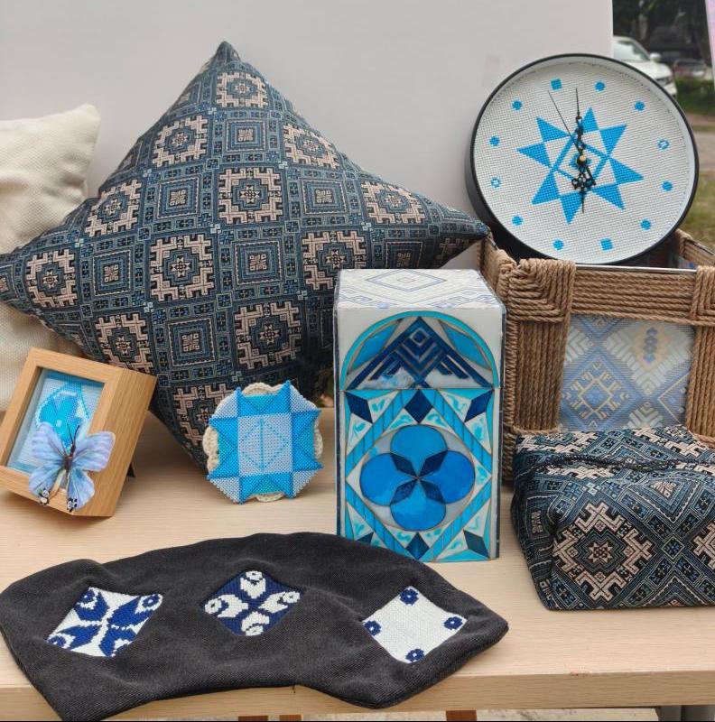 展区内,各类融合非遗元素的家居作品吸引了不少师生驻足观赏,其中扎染小组的作品尤为亮眼。据了解,小组成员创新采用“手绘+AI软件”结合的方式,对苗族传统鱼纹、蝴蝶纹、回纹等纹样进行解构重组,将古老纹样提炼为适配现代审美的极简线条;随后运用植物染工艺反复浸染织物,使成品在蓝白渐变的色调中自然晕染出非遗技艺特有的肌理质感。