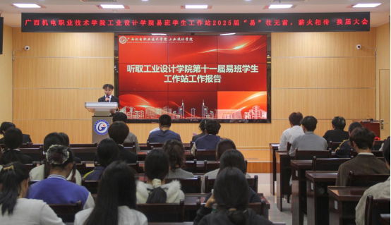 校易班代表随后上台发言,分享了校易班的工作经验与发展思路,表达了对工业设计学院易班学生工作站未来发展的美好祝愿,并期待双方进一步加强交流合作,共同打造优质校园育人平台。紧接着,第一届易班学生工作站负责人何承远作工作报告,全面回顾了任期内工作站在网络思政内容传播、校园文化活动策划、学生服务保障等领域的工作成效,客观剖析了现存不足,并结合易班网络思政发展趋势,为新一届工作站工作方向提出建设性建议,为工作传承与创新奠定坚实基础。