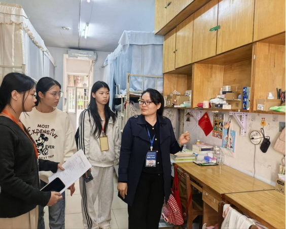 在黄梨锦副书记的带领下,各检查组有序前往对应宿舍楼开展工作。聚焦用电安全、消防安全、环境卫生及行为规范等领域,重点排查违规使用大功率电器、私拉乱接电线、存放易燃易爆或违禁物品、卫生脏乱差、堵塞消防通道等突出问题。检查过程中,工作人员逐一走访宿舍,仔细查看可能存在的安全隐患。对卫生整洁、布局规范的宿舍予以表扬并记录,作为评选文明宿舍的重要依据;对存在卫生问题的宿舍现场指导整改;对违规用电、占用通道等安全隐患坚持“零容忍”,现场收缴违规物品、下达整改通知书,明确责任人与整改时限,确保隐患及时消除。