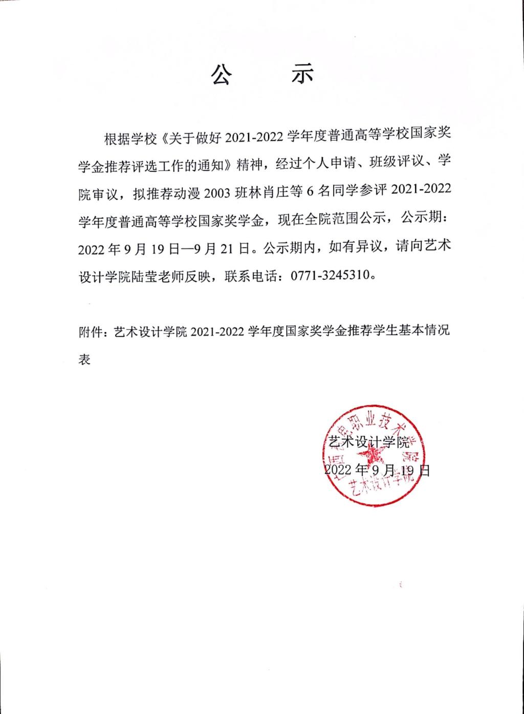 艺术设计学院2021-2022学年度普通高等学校国家奖学金公示