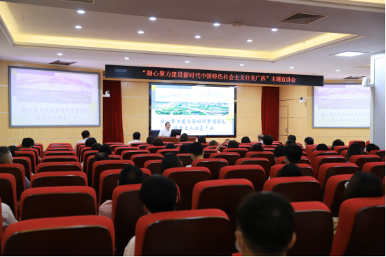 按照学校党委再次学习习近平总书记视察广西重要讲话精神的安排,6月7日下午,学校党委委员、副校长梁庆杰在博远楼五楼一号报告厅开展“凝心聚力建设新时代中国特色社会主义壮美广西”主题宣讲会,艺术设计学院负责人刘永福教授主持会议。财务设备直属党支部、艺术设计学院党总支部、建筑工程学院党总支部全体党员及发展对象、入党积极分子代表近300余人参加会议。