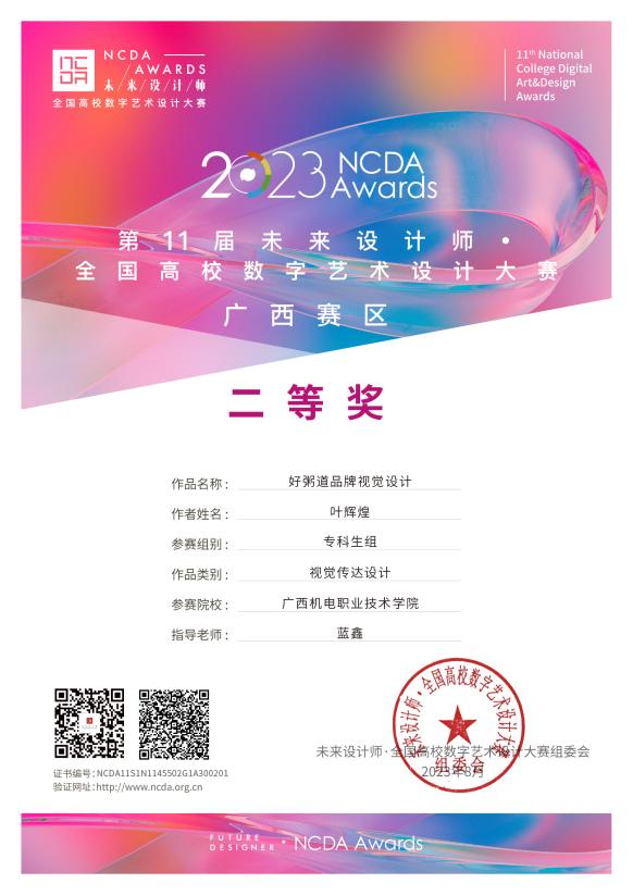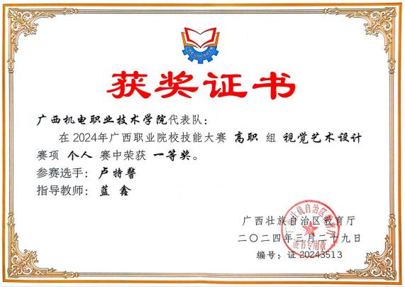 在竞赛指导领域展现出强大的育人实力,2023 - 2024 年期间,指导学生在全国高校数字艺术设计大赛广西区赛、职业技能竞赛视觉艺术设计赛项等专业赛事中屡获佳绩,接连斩获区赛一等奖、二等奖等多个重要奖项,助力学生在专业舞台上绽放光彩,以斐然成果彰显其卓越的教学实践与指导能力,为培养高素质专业人才、提升学校专业影响力作出突出贡献。