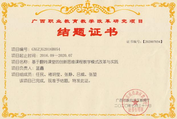 1. 主持完成广西职业教育教学改革研究项目《基于翻转课堂的创新思维课程教学模式改革与实践》