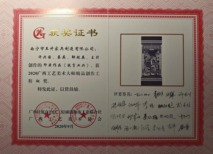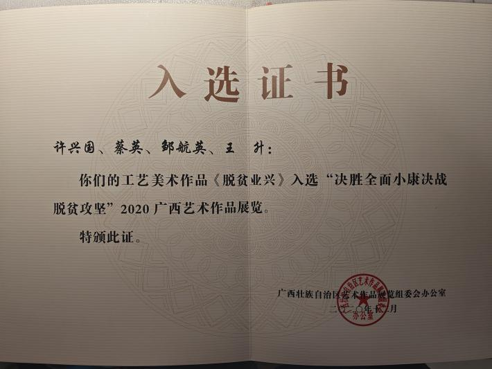 3、主创蜡染作品《脱贫业兴》获2020广西工艺美术大师精品创作工程铜奖