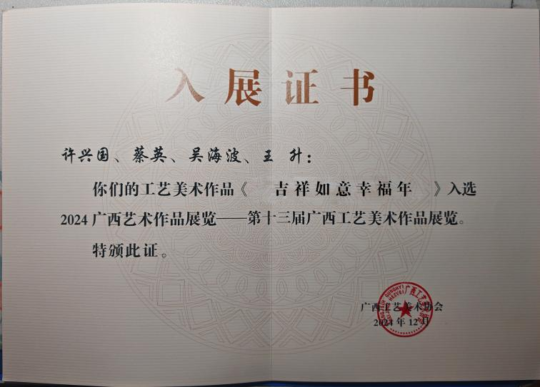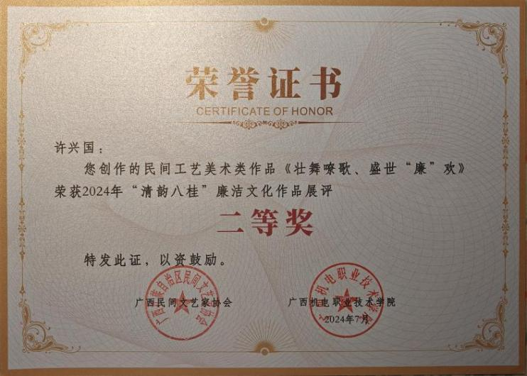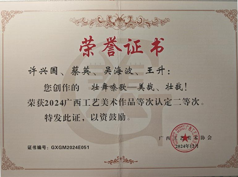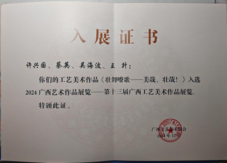 13、主创蜡染作品《壮舞嘹歌、盛世“廉”欢》获2024年“清韵八桂”廉洁文化作品展二等奖;(颁奖单位:广西民间文艺家协会、awc77万象城官网)
