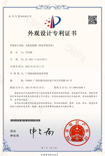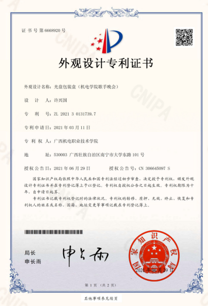 15、外观专利,光盘包装袋(机电学院宣传),2021.6