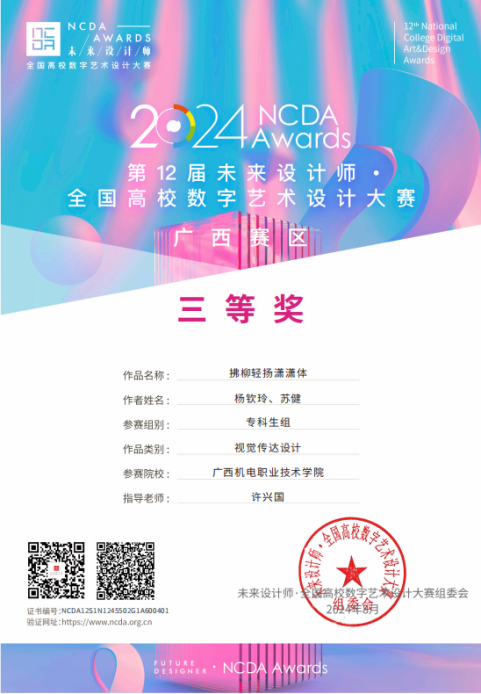 15、独立指导学生作品《拂柳轻扬潇潇体》获未来设计师.全国高校数字艺术设计大赛广西赛区三等奖,2024.8