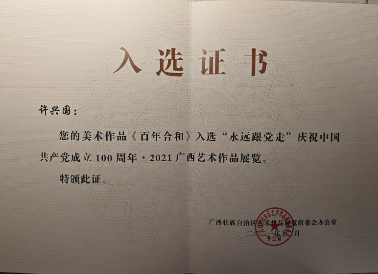6、主创美术作品《百年合和》入选“永远跟党走”庆祝中国共产党成立100周年.2021广西艺术作品展览