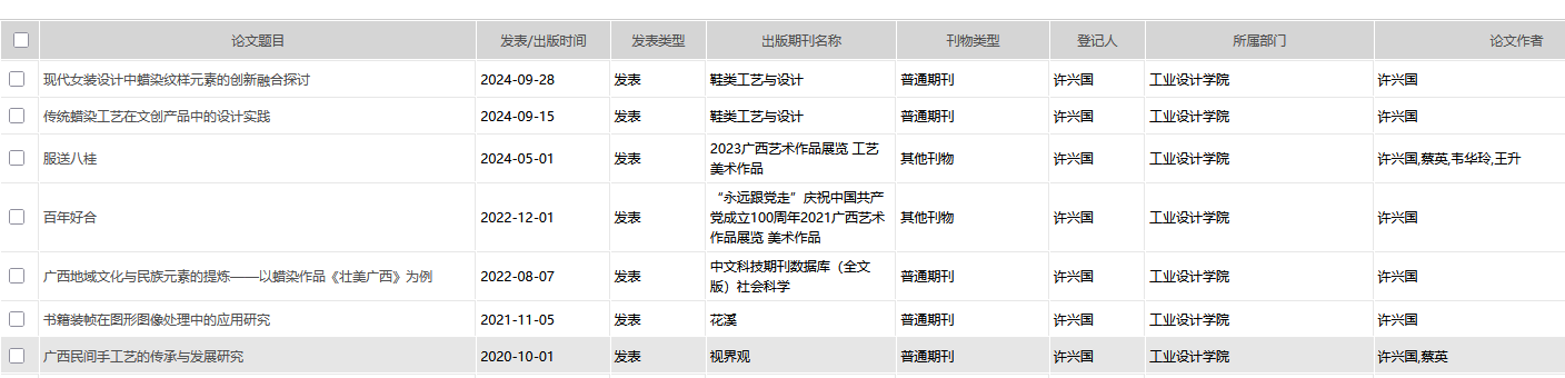 许兴国,教授、高级工艺美术师,中共党员,毕业于武汉大学,在学术研究、艺术创作与教学实践领域成绩斐然。近五年来,在科研与创作领域成果丰硕。学术著作上,作为第一主编编写《CorelDRAW 平面设计实例教程》,为专业教学提供优质参考;发表《广西民间手工艺的传承与发展研究》等多篇论文,深入探讨民间手工艺、地域文化与设计应用等主题,为相关领域发展提供理论支撑。创作实践中,《服送八桂》《百年好合》等作品多次入选广西重要艺术作品展览,展现出高超的艺术水准。在专利方面,他拥有十余项外观专利,涵盖包装、宣传册、摆件等多种类型,将设计创意转化为实际成果。