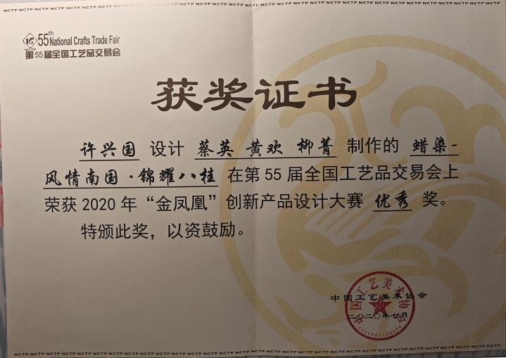 1、主创蜡染作品《风情南国、锦耀八桂》获2020年“金凤凰”创新产品设计大奖赛“优秀奖”(颁奖单位:中国工艺美术协会)