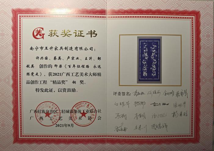 5、主创蜡染作品《百年征程路 永远跟党走》获2021广西工艺美术大师精品创作工程“精品奖”铜奖