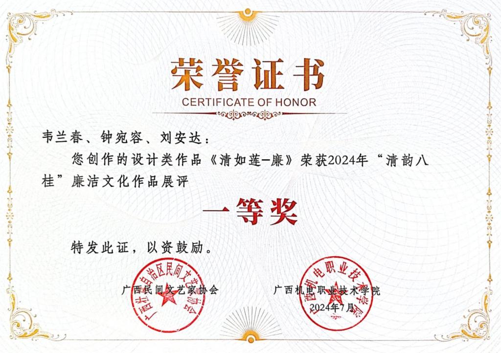 2. 2024年获得学校举办的“清韵八桂.廉洁文化”作品一等奖;