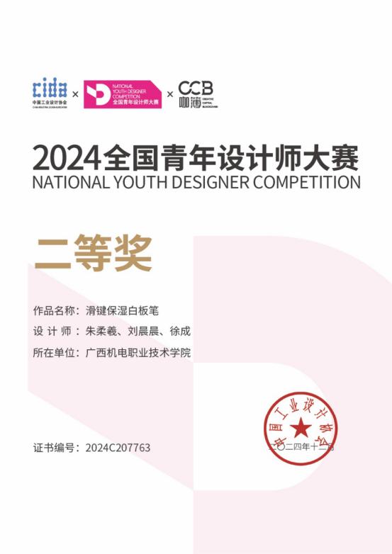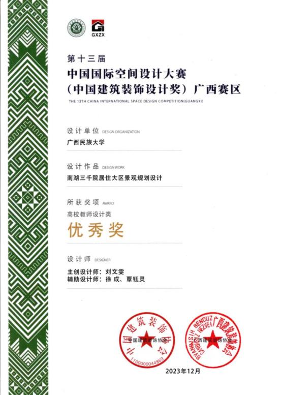 个人参赛获奖:2019 年《长沙市望城区滨江生态公园群概念设计国际投标竞赛方案》斩获一等奖,2020 年《北海老干部活动中心景观设计》荣获广西优秀工程勘察设计公共建筑设计类二等奖,2022 《南湖三千院大区景观》中国国际空间设计大赛广西赛区中荣获铜奖;2024《滑键保湿白板笔》荣获全国青年设计师大赛二等奖